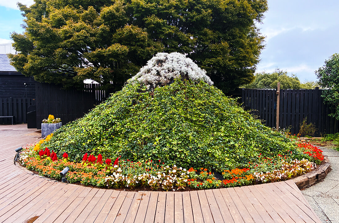 四季折々の変化に富んだ、草花で形作られた小型の富士山。