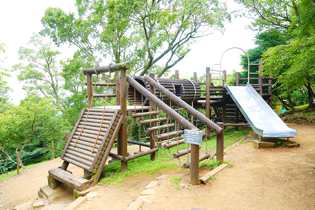 丸太渡りやすべり台などがあるアスレチック施設。自然の中で遊べば、爽快感もひとしおです。