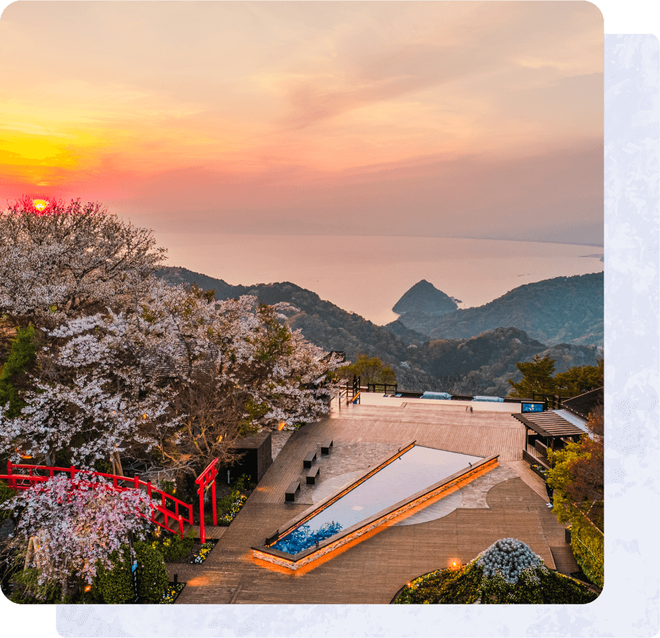 碧テラスの特等席。水盤越しの絶景を楽しみながらゆっくりとおくつろぎください。
