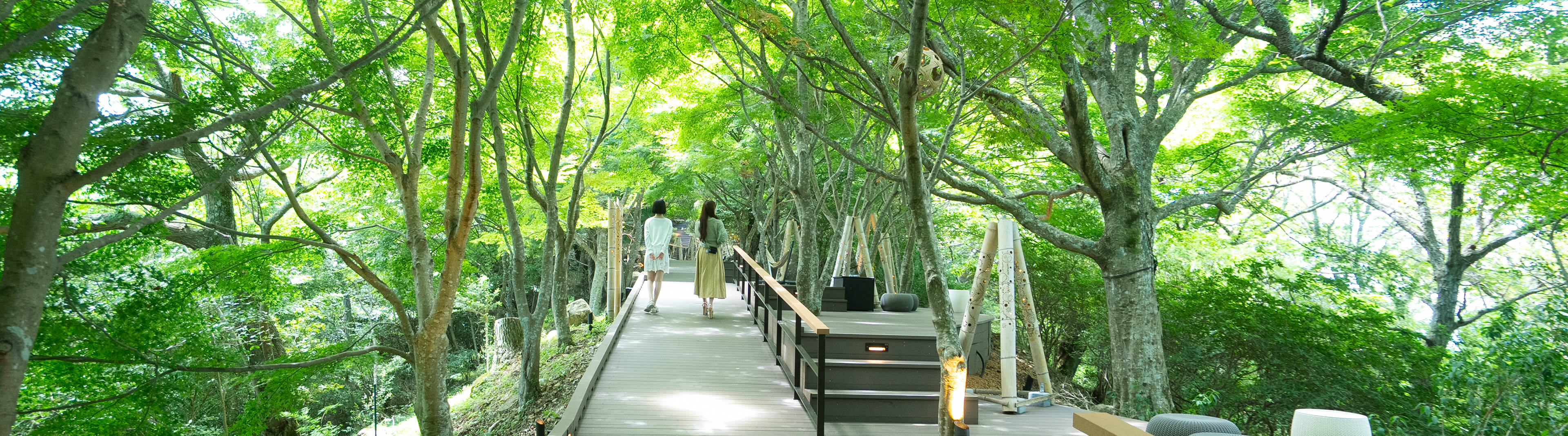 山頂に建つオーバル型の展望台「アクアリング」からは360度の大パノラマが広がり、先に進むと木漏れ日が美しい小径「フォレストウォーク」へ。