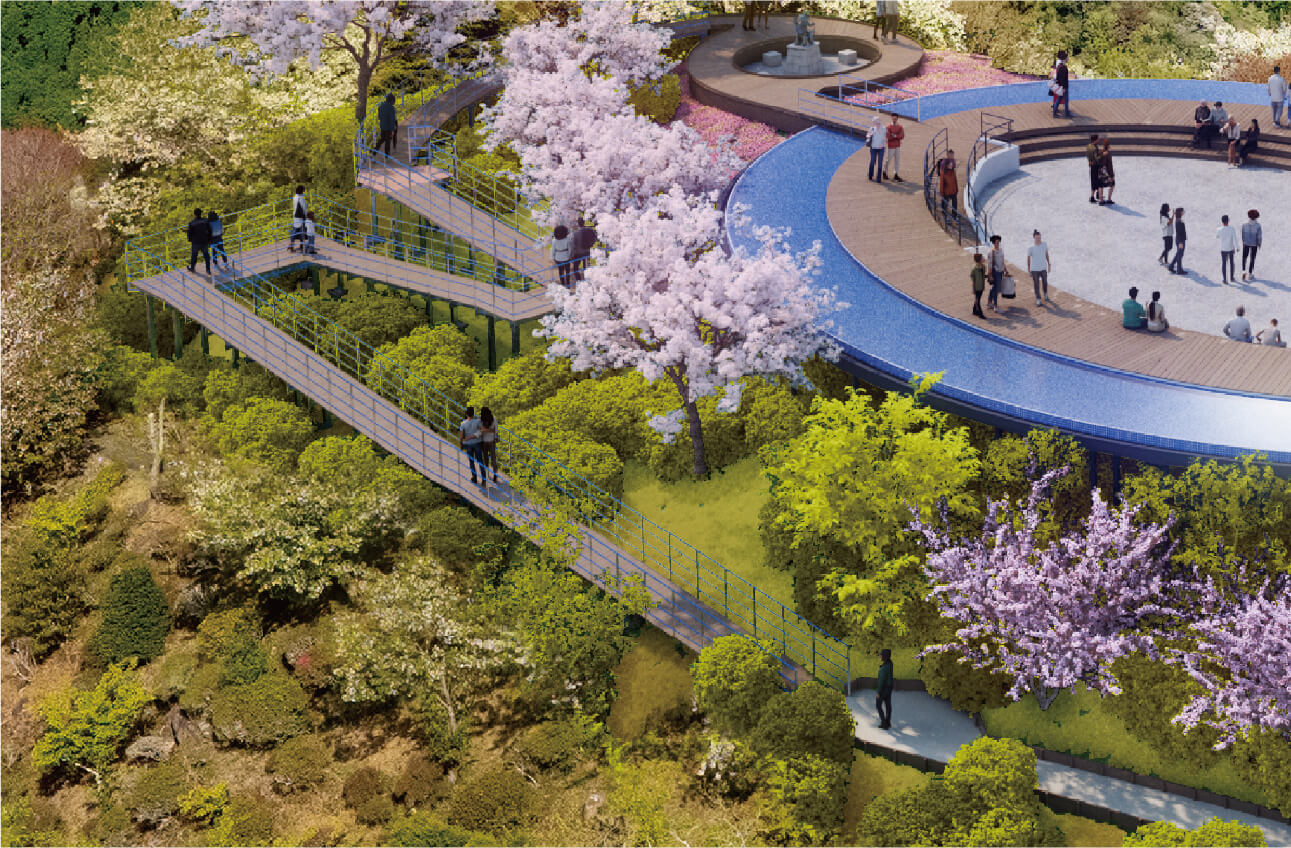 さらに先の階段を上がると現れる「グランドループ」は、円形にデザインされた展望スポット。
