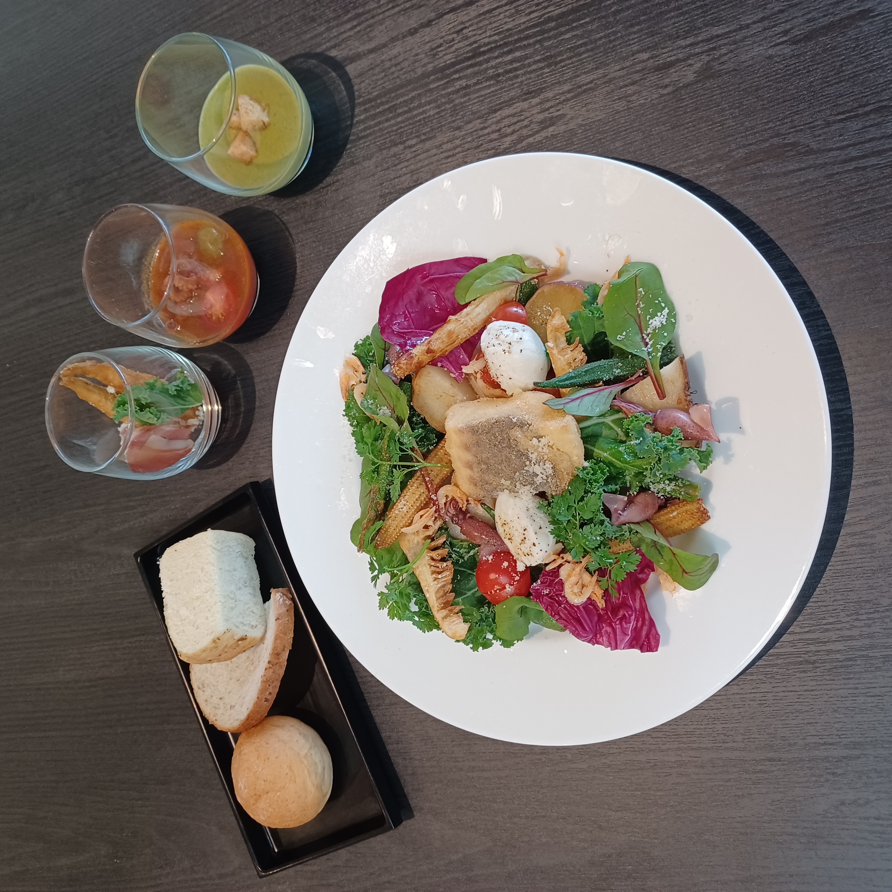 食感の良いセモリナ粉でさっくりと揚げた沼津港産の真鯛と、フレッシュで彩り豊か