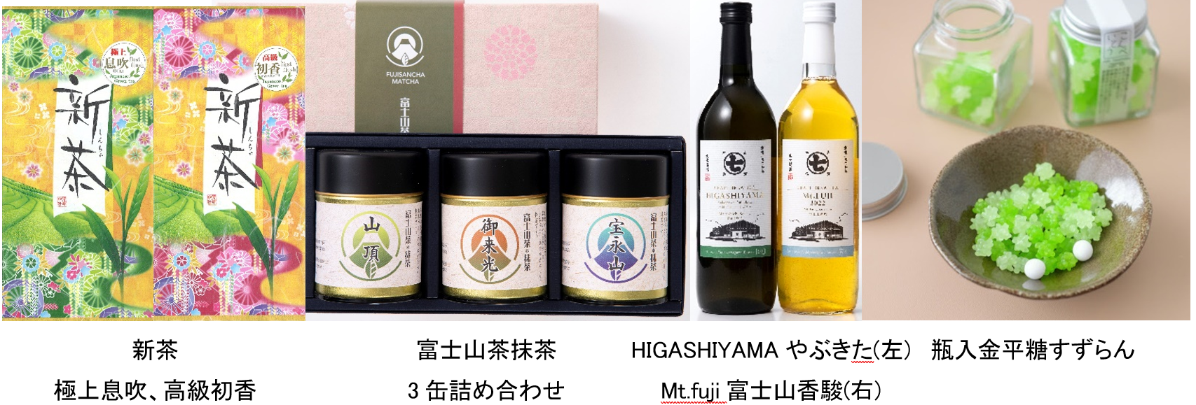 HIGASHIYAMAやぶきた、Mt.fuji富士山香駿、瓶入金平糖すずらん