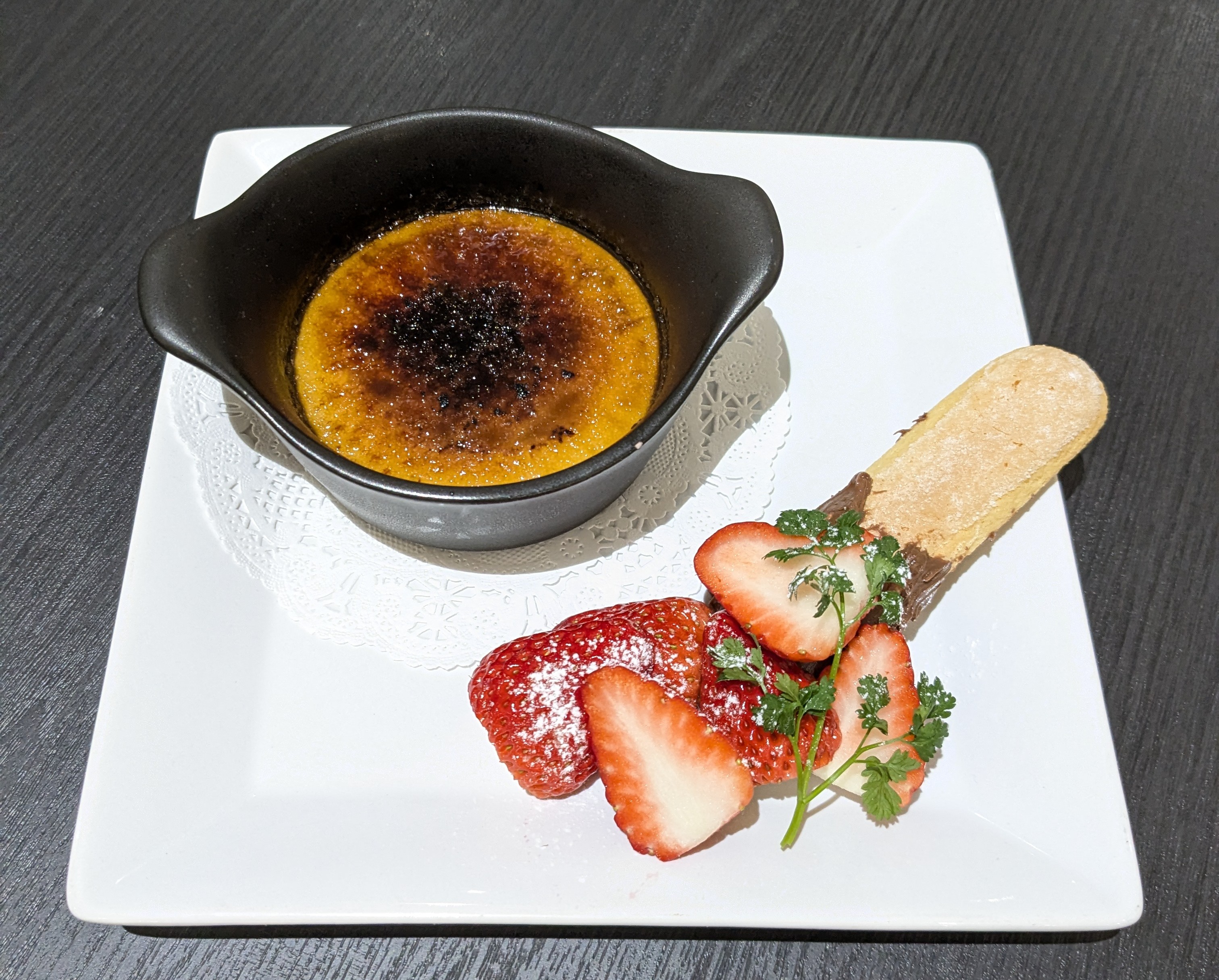 ご注文をいただいてから表面を香ばしく焼き上げ、ほろ苦くパリッとした食感に仕上げたクレームブリュレに、伊豆産の紅ほっぺを添えた、期間限定メニューです。バニラが香る濃厚でなめらかなカスタードとともに、旬を迎えた甘酸っぱい苺をお楽しみいただけます。