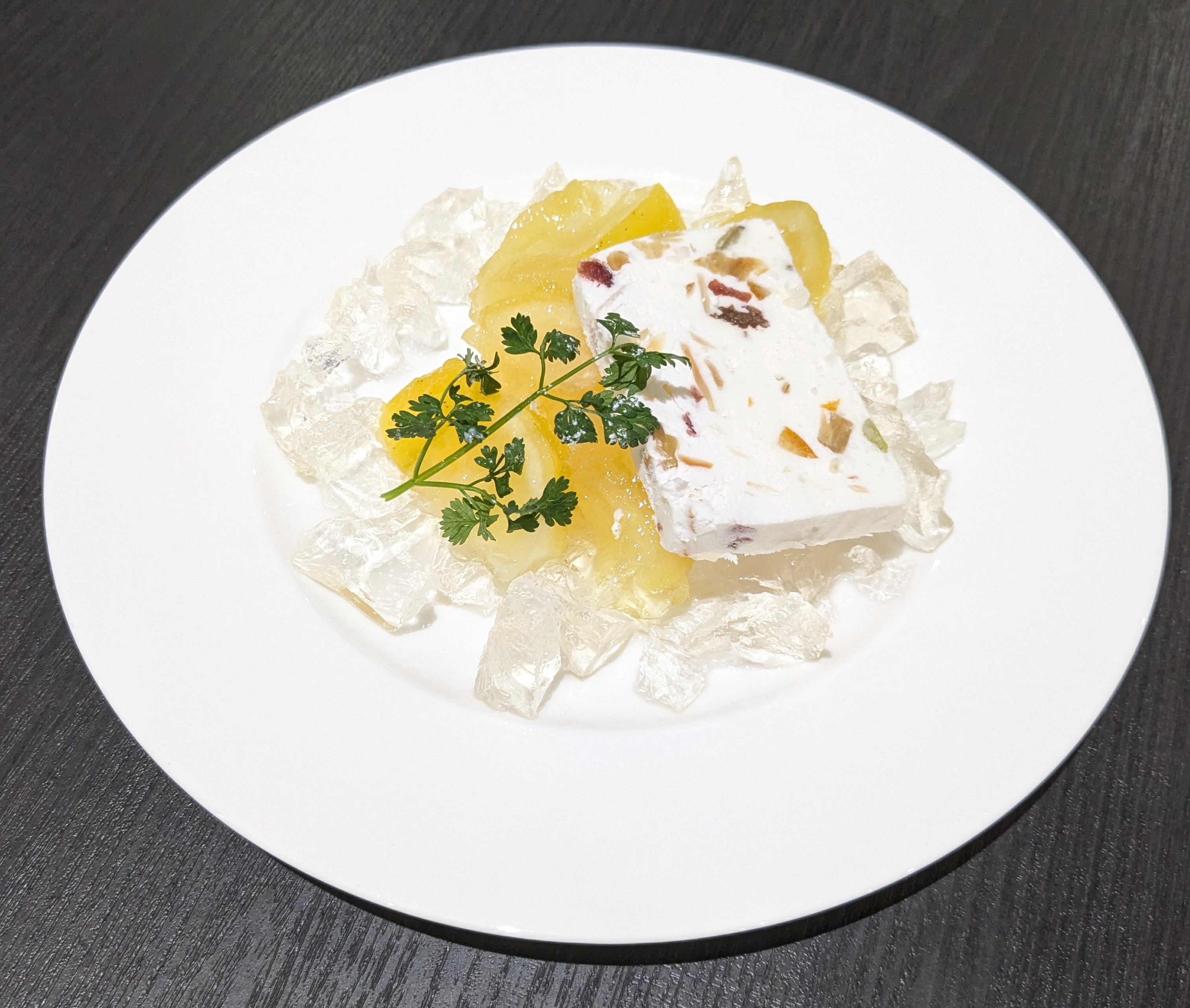 旬の東伊豆産ニューサマーオレンジを皮までまるごと使用し、テリーヌ型でゼリーに仕上げた初夏にぴったりの季節限定メニューです。爽やかな柑橘味の特製ゼリーをカッサータのナッツやドライフルーツの食感、クリーミーなチーズの味わいとともにお楽しみください。
