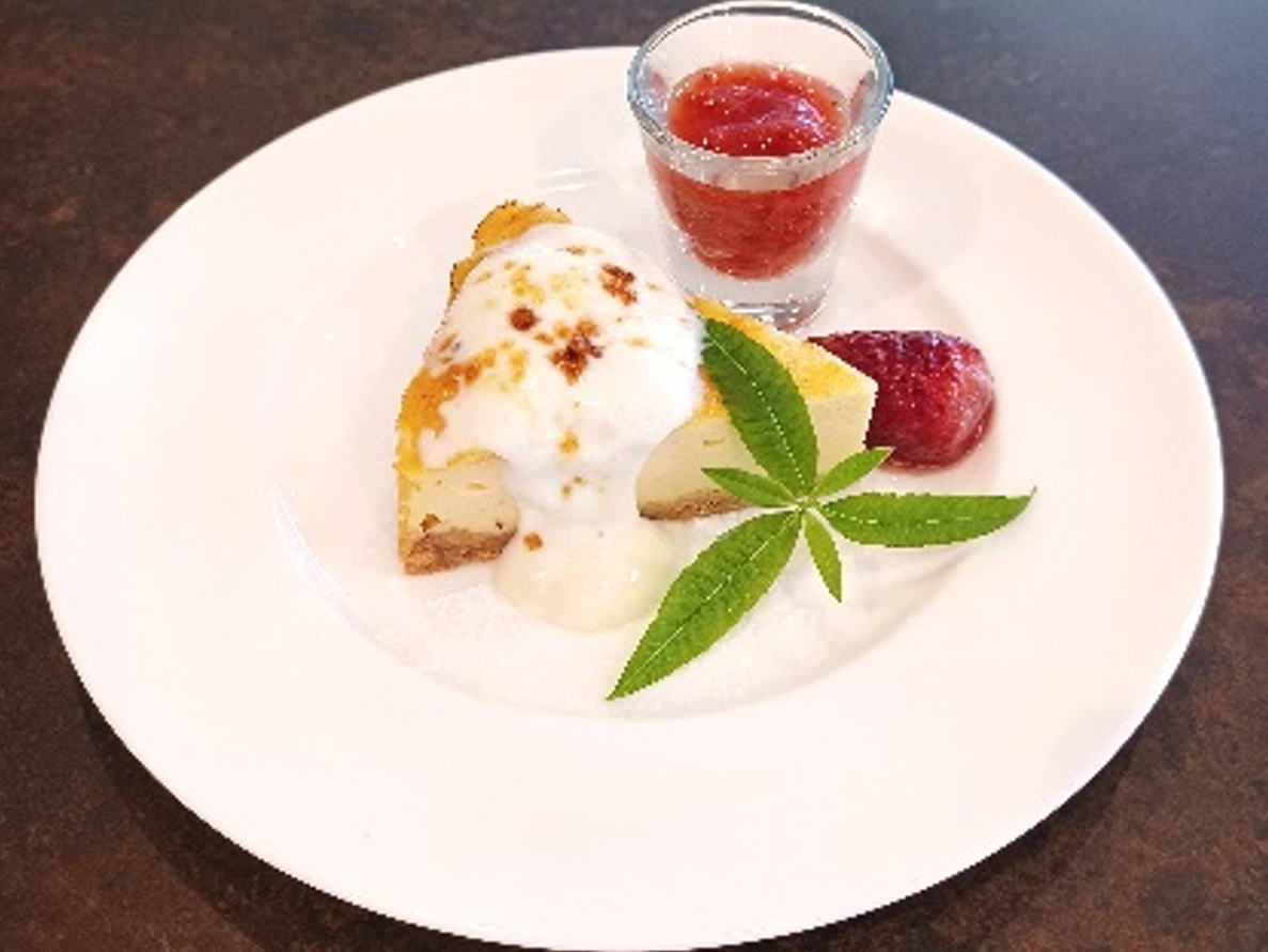 ドルチェメニュー「静岡紅ほっぺとブルーチーズソース濃厚チーズケーキ」