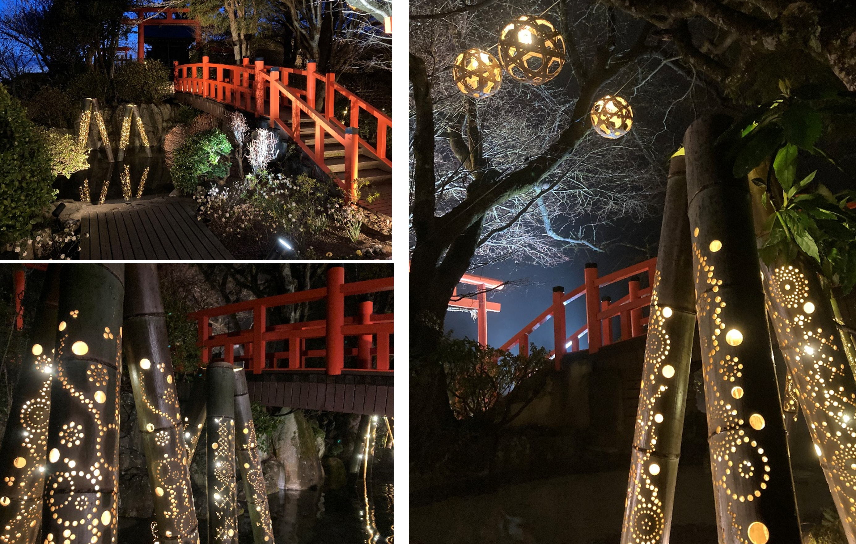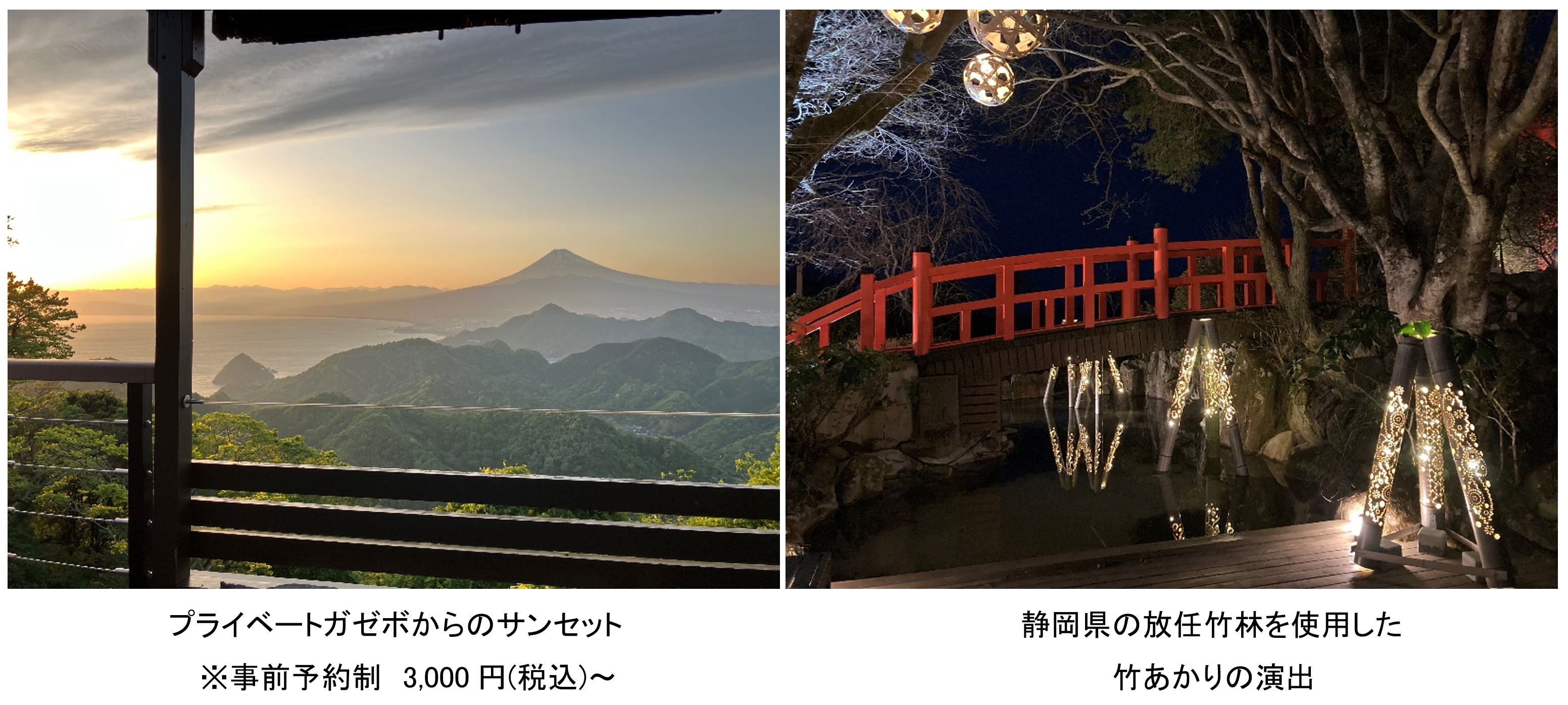 今年は、サンセットとライトアップの時間に合わせ、絶景個室空間「プライベートガゼボ」の営業も行い、幻想的な空間で駿河湾に沈むサンセットと、伊豆の国市・沼津市の夜景をお楽しみいただけます。また、碧テラスにある葛城神社周辺から昨秋リニューアルオープンしたフォレストウォーク、グランドループへと続く散策路には静岡県内の放任竹林を活用した「竹あかり」による照明演出を施しております。