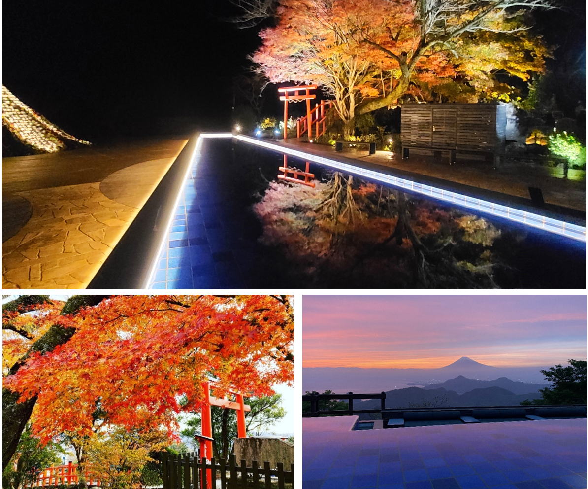 冠雪した富士山は世界の宝に相応しく荘厳な美しさを誇り、周辺では紅葉の美しさが心に染み入る季節になってきます。日中は生命力豊かな樹々が光に照らされ秋の美しさを感じられ、夕方になり陽が彼方へ傾くと、駿河湾を茜色に輝かせた美しいサンセットもご覧いただけます。伊豆パノラマパークでは、葛城山、富士山、駿河湾が最も美しくなる紅葉最盛期に『碧テラス煌めく紅葉ライトアップ&駿河湾サンセット鑑賞』イベントを実施するほか、秋のお出かけシーズンに相応しいたくさんの企画を実施いたします。