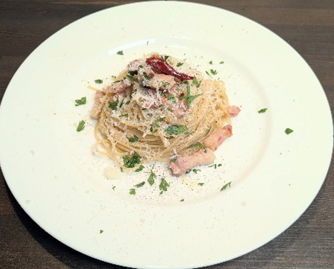 - 静岡県産の豚バラ肉をトラットリア伊豆パラディーゾで塩漬け、熟成させて作った自家製パンチェッタに、イタリア産のくせのない羊乳のチーズ「ペコリーノ・ロマーノ」を使用したクリーミー仕立てのペペロンチーノです。