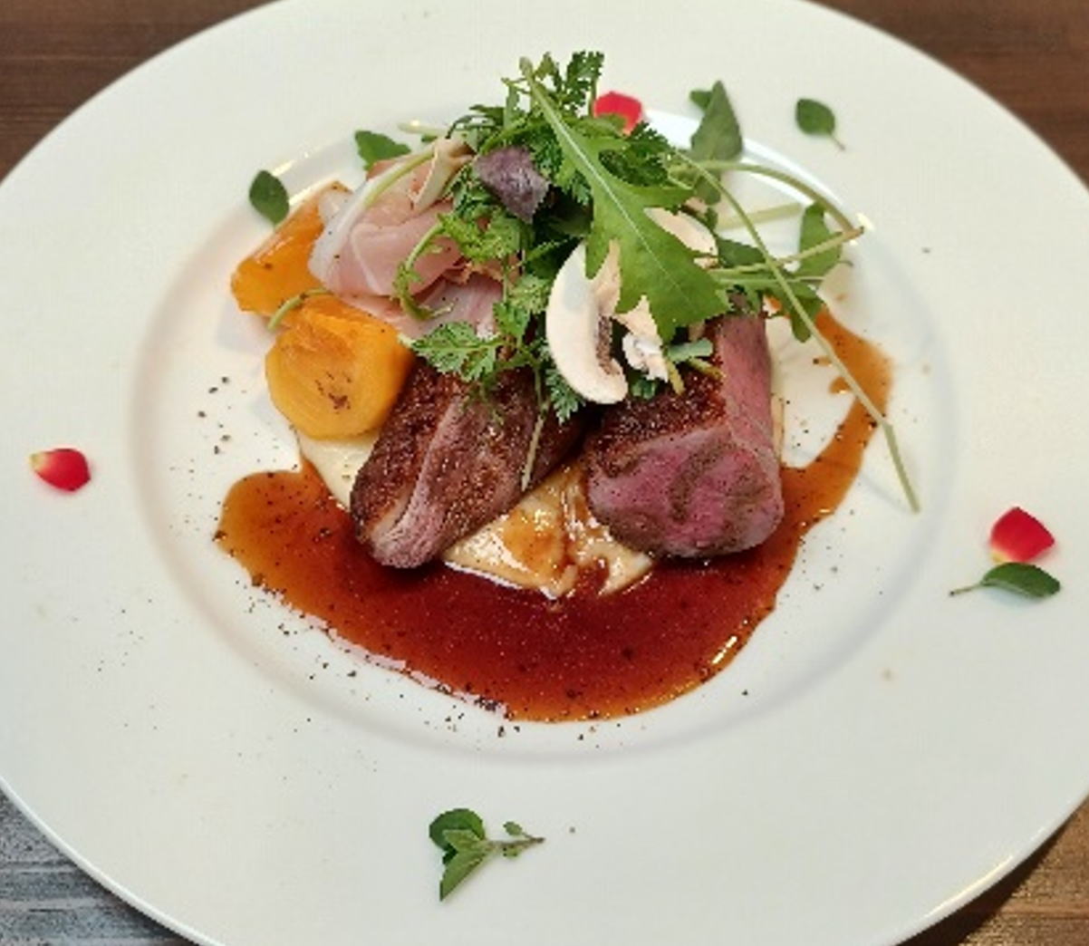 - 低温調理で中はしっとり、皮はパリッと仕上げた鴨肉に、静岡県長泉町の特産品「四ツ溝柿」を香り高く甘酸っぱいアマレットリキュールで味付けした期間限定メニュー「鴨肉のロースト四ツ溝柿のサラダ添えアマレット風味」を販売いたします。