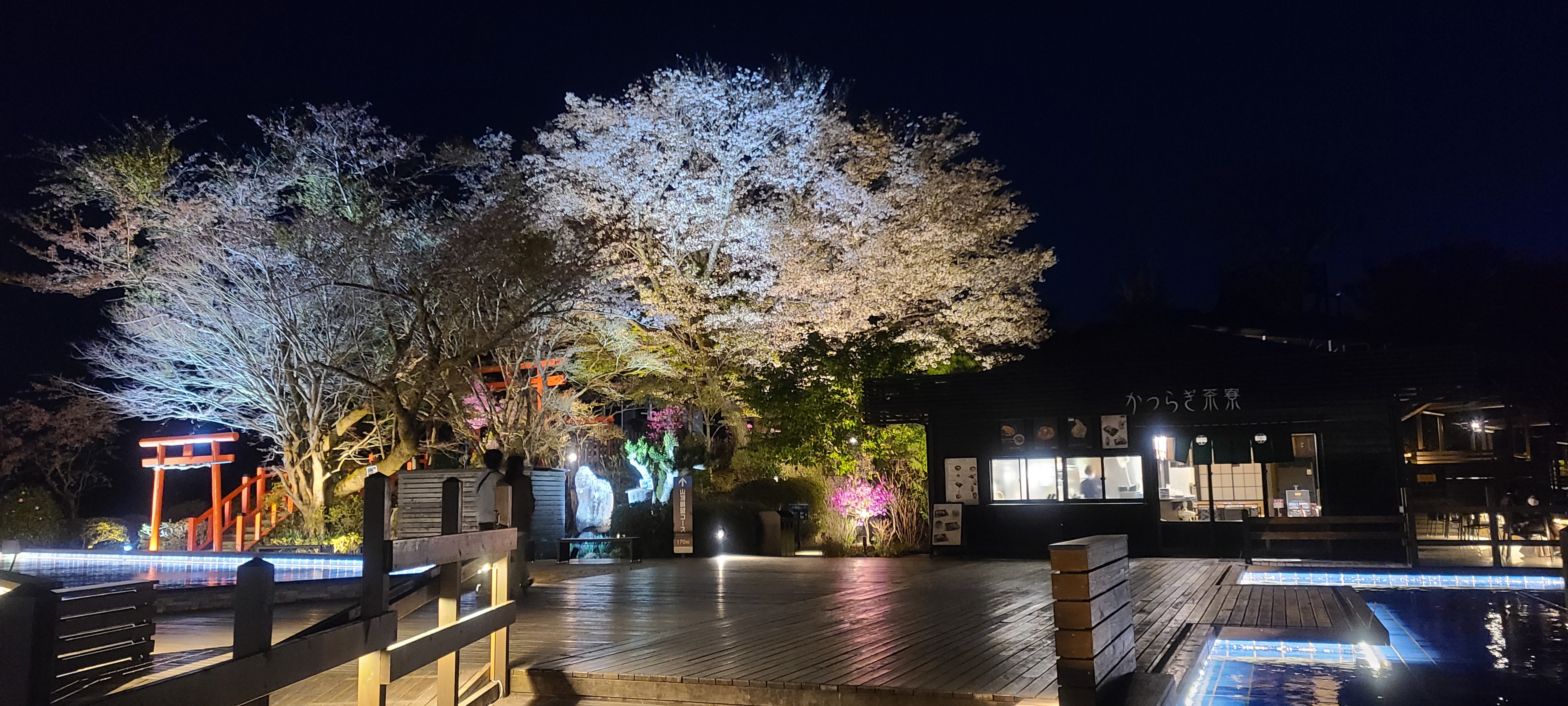 日が沈んだら、幻想的にライトアップされた夜桜を見ながら、夜の特別な雰囲気に包まれる碧テラスを散策。